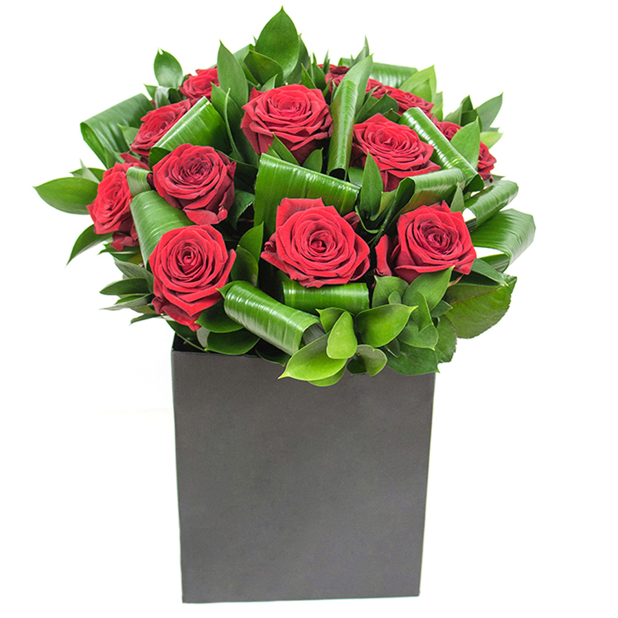 Immerse yourself in the majesty of our red roses bouquet, a perfect fusion of deep red passion and verdant life. This sophisticated arrangement pairs luxurious red roses with fresh aspidistra leaves and delicate ruscus, resulting in an ensemble that is both timeless and modern. Every flower is hand-selected with great care to deliver unmatched freshness and quality, making it an ideal gift or centerpiece.