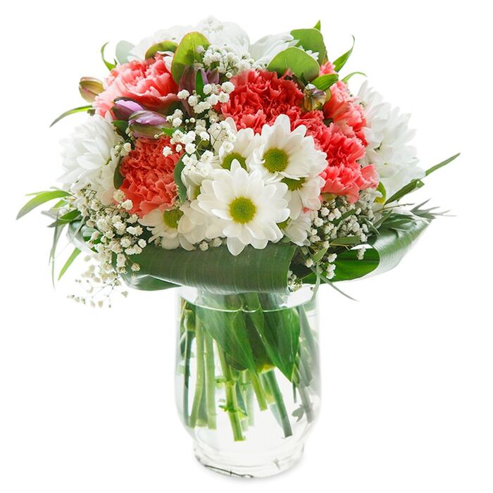 There is a sense of gentle exuberance in this Colindale bouquet: a vibrant cluster of coral, peach, and red carnations, their petals thick and softly ruffled, rise gracefully from a spotless white gift bag. Sprightly white daisies, each with a gleaming yellow-green center, add brightness and a youthful energy, as if mirroring the fresh starts along Colindale's tree-lined walks. Airy sprigs of baby's breath weave through the composition, contributing a lightness reminiscent of clouds drifting across Silkstream Valley Park. The bouquet's base is cradled in glossy, rich green foliage that curls in elegant arcs, underscoring the natural abundance and grounding the arrangement. Touches of still-closed, purple-tinged buds peek out along one side, lending intrigue-like hidden gems in a neighbourhood garden. The sturdy ribbon handles above the squared gift bag invite convenient delivery, ideal for brightening doorsteps or tables from Grahame Park to Montrose Avenue. Flooded with clear, natural light, the colours appear exuberant yet harmonious, conveying joy, thoughtfulness, and a well-loved local touch. Every petal and leaf, placed with expertise, reflects the artistry and warmth that defines flower gifting across Colindale, whether for a surprise birthday, heartfelt thank you, or simply to share a little everyday beauty. Brimming with colour and texture, this expertly composed bouquet brings a burst of seasonal joy straight from Colindale's local florist scene. At its centre, pure white daisies with green centres radiate promise and innocence. Intermingled, coral-pink carnations weave ruffled softness, reminiscent of sunrise over residential gardens near Colin Park Road. Wisps of cloudlike baby's breath lend an airy, almost ethereal dimension, while sprigs of eucalyptus-soft green and gently aromatic-anchor the bouquet with a modern touch. Tucked discreetly beneath, blush-tipped alstroemeria buds suggest new beginnings still unfolding. Balanced and circular, the whole arrangement captures a feeling of fresh optimism: it feels at home gracing a kitchen table after a delivery from Colindale Flowers, or as a thoughtful gesture to brighten someone's week in NW9. The vivid palette and crisp framing invite joy, gratitude, and the spirit of celebration, skillfully reflecting local expertise and the care that defines neighbourhood floral design. Awash in soft morning light, this cheerful bouquet features vivid coral carnations and sparkling white chrysanthemums, all artfully gathered by Colindale Flowers for residents throughout NW9. The carnations' ruffled petals are alive with movement, encircled by snowy daisy-like blooms and pops of classic white daisies, each with a fresh green-yellow centre that recalls the simplicity of local meadows. Airy sprays of gentle white baby's breath swirl between the main blossoms, adding lightness and depth to the ensemble. Close on one side, a few magenta alstroemeria buds nestle amid the foliage, promising a subtle change of colour over time. The bouquet is gracefully framed by broad, glossy green leaves-some arching gently outward, others weaving among the flowers-imbuing it with grounded elegance. Stems stand tall in a clear glass vase, immersed in water that magnifies their verdant hues. Set against a pure white background, the vibrant blooms and greenery command full attention, their intricate textures and colours strikingly vivid. This fresh, uplifting arrangement by Colindale Flowers is perfect for celebrating life's everyday milestones, offering comfort, or brightening a loved one's kitchen near Grahame Park. Its blend of colour, form, and light fragrance brings a sense of warmth and optimism to any setting.